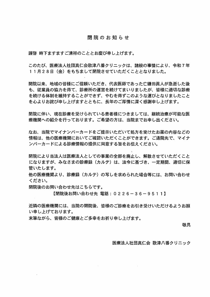 このたび医療法人社団真仁会歌津八番クリニックは、令和7年11月28日(金)をもちまして閉院させていただくことになりました。